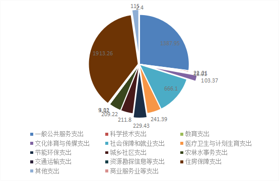 按功能科目分类:其中一般公共服务支出1387.95万元,占总支出的19.78%。教育支出18.01万元,占总支出的0.26%。科学技术支出22.21万占总支出的0.32%。文化体育与传媒支出103.37万元,占总支出的1.47%。社会保障和就业支出666.1万元,占总支出的9.5%。医疗卫生与计划生育支出241.39万元,占总支出的3.44%。节能环保支出229.43万元,占总支出的3.27%。城乡社区支出211.8万元,占总支出的3.02%。农林水支出209.22万元,占总支出的2.98%,交通运输支出3.02万元,占总支出的0.04%。资源勘探信息等支出9.11元,占总支出的0.13%。商业服务业等支出2.4万元,占总支出的0.03% 。住房保障支出1913.26万元,占总支出的27.27%。其他支出115万元,占总支出的1.64%。