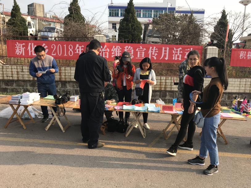 3月7日,新化司法所、综治办、公安、交警、林业、民政、社保、计生、卫生、农科、天保所等综治维稳成员单位,集中开展“三月综治维稳宣传月”活动。 宣传活动着眼维护“两会”期间稳定大局、立足创建和谐平安新化,以部门联动为抓手、以群众喜闻乐见为主旨,贴近群众、贴近生活、贴近实际,突出综治维稳(平安建设)的地位、作用、成效;突出宣传“发展是硬道理,稳定是硬任务”的重要思想和“以平安铸和谐,以稳定保和谐,以发展促和谐”的举措和典型;宣传活动发放、展出了大量介绍缉枪治爆、扫黑除恶、禁毒防艾、防范诈骗、预防未成年人犯罪、道路交通安全、流动人口管理等知识的宣传册