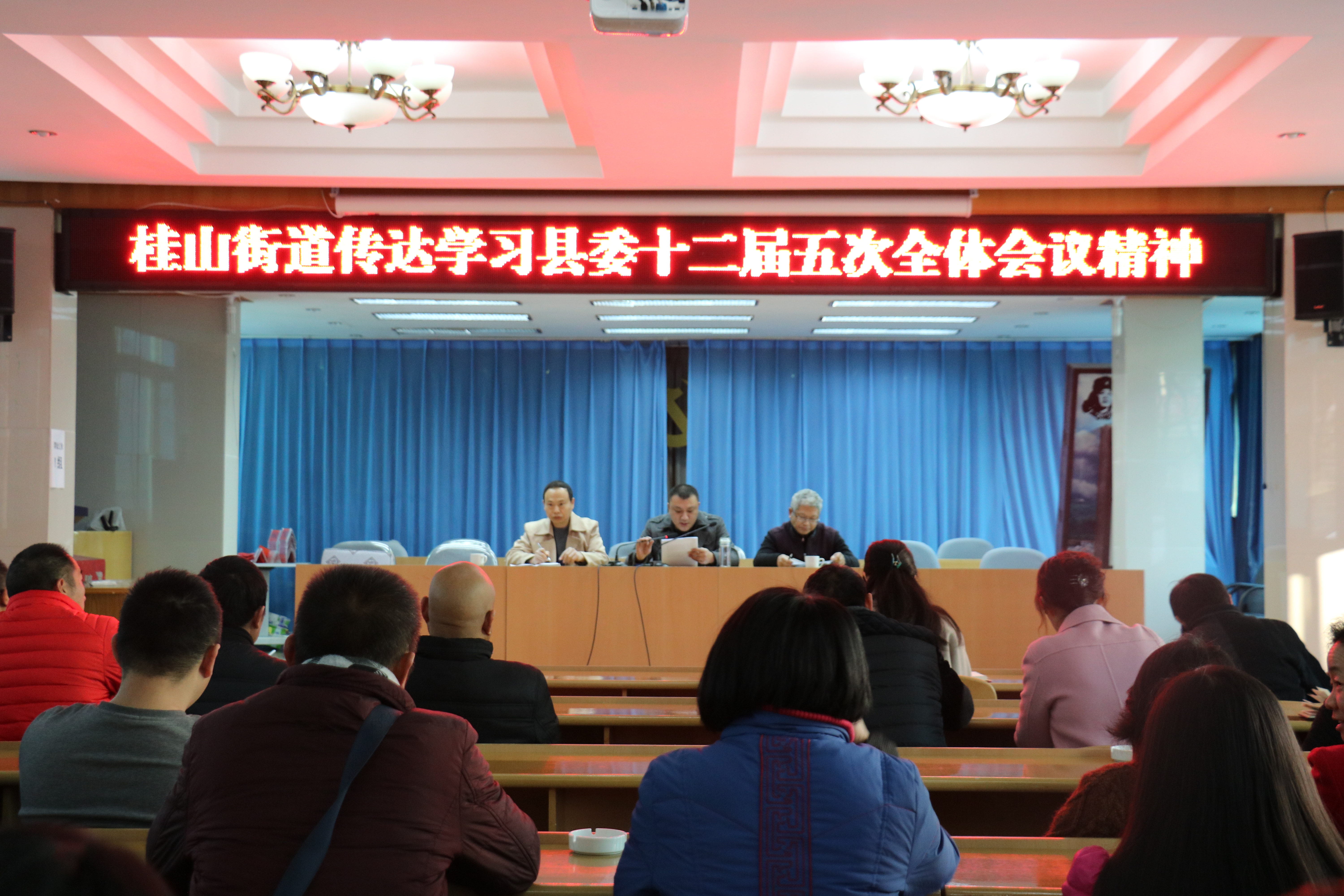 会议认为,县委工作报告内容务实,思路清晰,通过学习,干部职工深受鼓舞,纷纷表示要认真传达学习县委十二届五次全会精神,将思想和行动统一到会议精神上来,落实到各项具体工作中,为全面建成小康社会贡献力量。 会议对桂山街道2017年工作和2018年工作做了简要总结和部署,指出2017年桂山街道各项工作取得了新突破,特别是在棚户区改造、基础设施建设等方面取得了明显的工作成效,干部职工在披荆斩棘中锻造了新作风,在负重前行中展现了新担当,在突破创新中展示了新作为。2018年桂山街道将紧扣“十三五”发展思路,以强烈的政治担当、豪迈的工作激情、坚韧的意志品质、超常的工作举措,续写桂山街道改革发展新篇章。 会议要求,街道上下要认真学习领会县委全会精神,进一步把思想、行动统一到县委、县政府的思路目标上来,一要提高认识,层层传达学习,将县委十二届五次全会精神传达到每一位党员和群众;二要把学习贯彻党的十九大精神与学习贯彻县委十二届五次全会精神相结合;三要把2018年工作的谋划与学习贯彻县委十二届五次全会精神相结合,统筹协调,早谋划、早部署,确保2018年工作起好步、开好局。