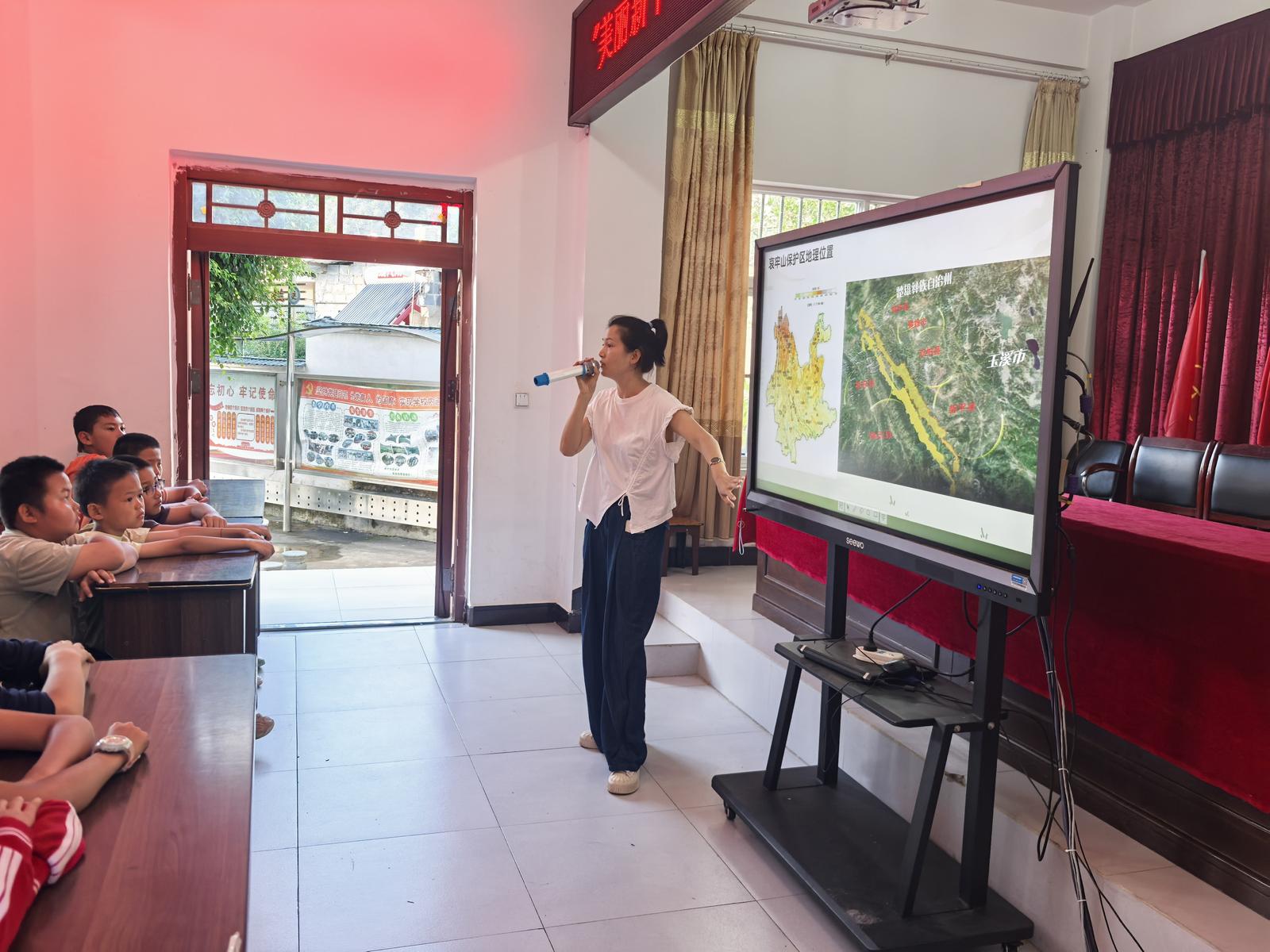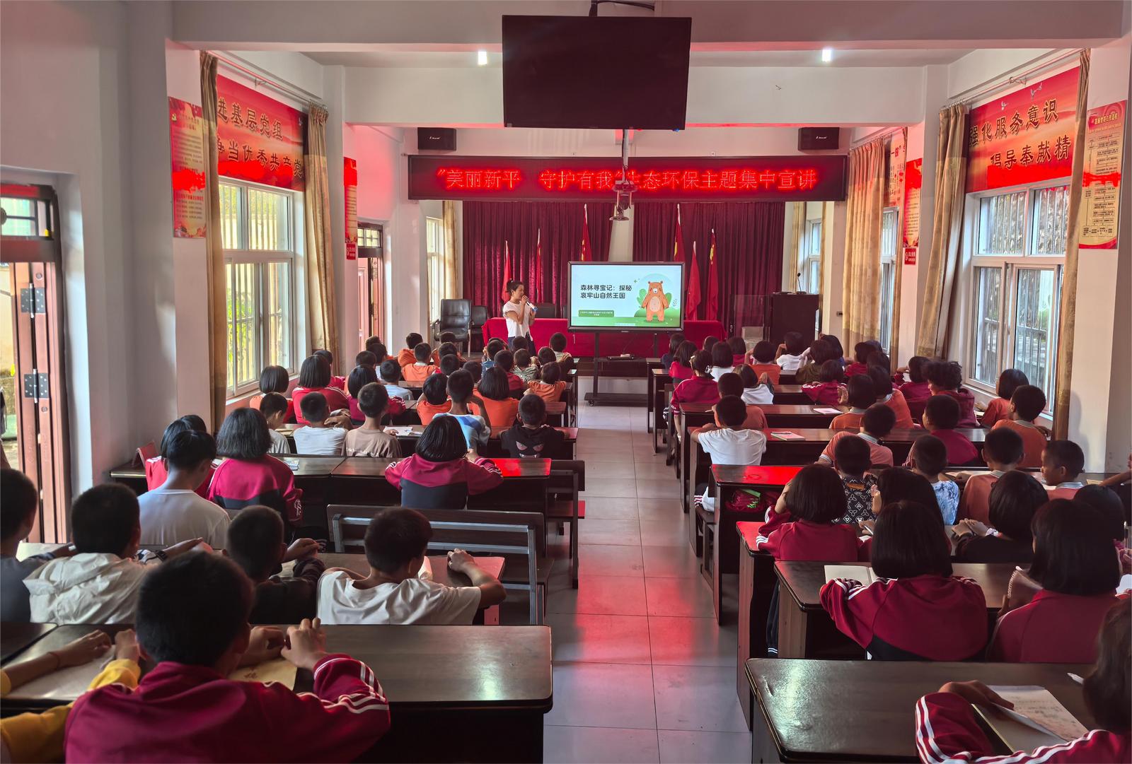 “同学们知道吗?哀牢山是新平珍贵的生态宝库,被称作‘生物基因库’,各种珍稀动植物数不胜数,不仅有国家一级保护动物黑长臂猿、灰叶猴,还有被誉为‘植物届大熊猫’的喜马拉雅红豆杉、‘冥界之花’水晶兰等珍稀植物,现在我将要带领大家开启一场‘哀牢山探秘之旅’。”宣讲现场,王勤丽老师用通俗易懂的语言和图文并茂的ppt,将专业的生态知识转化为孩子们易于理解的内容,详细介绍了哀牢山动植物的生活习性和生长特点,以及哀牢山独特的气候环境。当看到视频中黑长臂猿在林间灵活跳跃、红豆杉结出鲜红果实的画面时,同学们纷纷发出惊叹,眼中满是对家乡生态宝库的好奇与自豪。