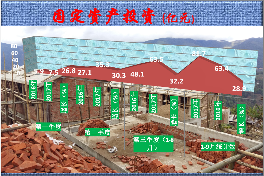 (三)投资增速回升。1-8月,全县规模以上固定资产投资完成63.5亿元,同比增长32.2%,增速比1-7月提高10.8个百分点;1-9月,全县规模以上固定资产投资完成81.7亿元,同比增长28.9%,完成市级目标57.5%,滞后17.5个百分点。