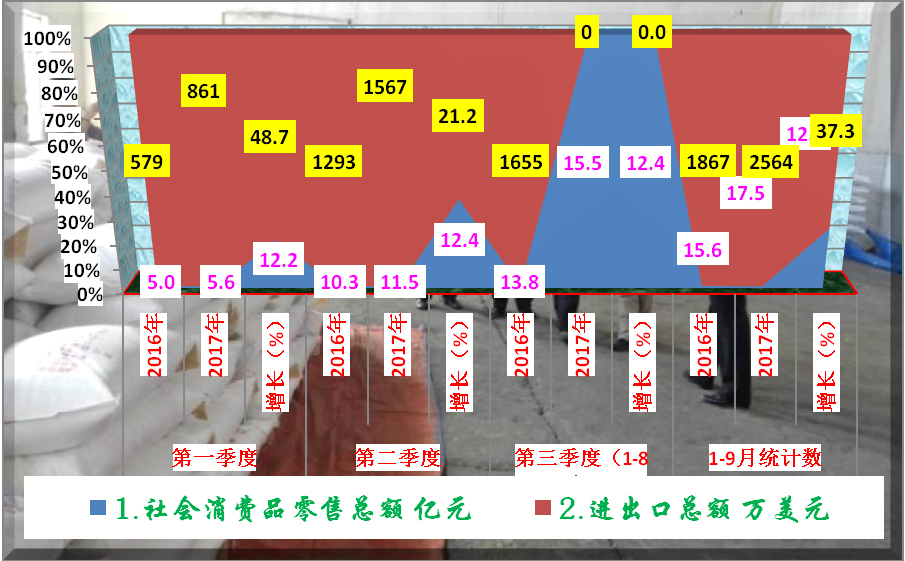 (四)消费市场平稳,服务业增速加快。1-8月全县社会消费品零售总额实现15.5亿元,同比增长12.4%;1-9月全县社会消费品零售总额实现17.5亿元,同比增长12.4%,完成市级目标71.5%,滞后3.5个百分点。进出口无突破。