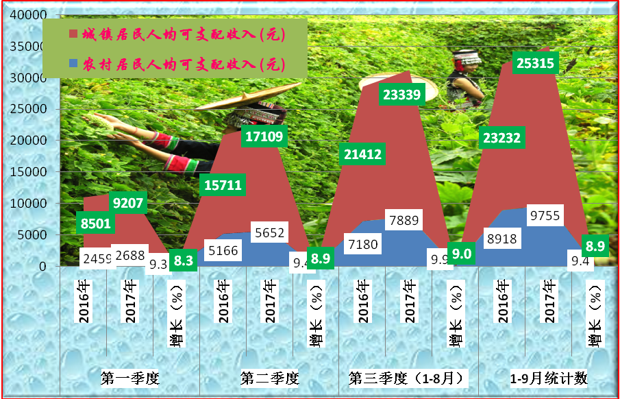 (七)民生改善显著。一是收入稳步增长。受就业等积极因素带动,城乡居民收入稳步增长,1-8月,实现城镇居民人均可支配收入23339元,增长9.0%,1-9月完成25315元,增长8.9%,完成市级目标72.6%,滞后2.4个百分点;1-8月,实现农村居民人均可支配收入7889元,增长9.9%,1-9月完成9755元,增长9.4%,完成市级目标79.1%,提前4.1个百分点。