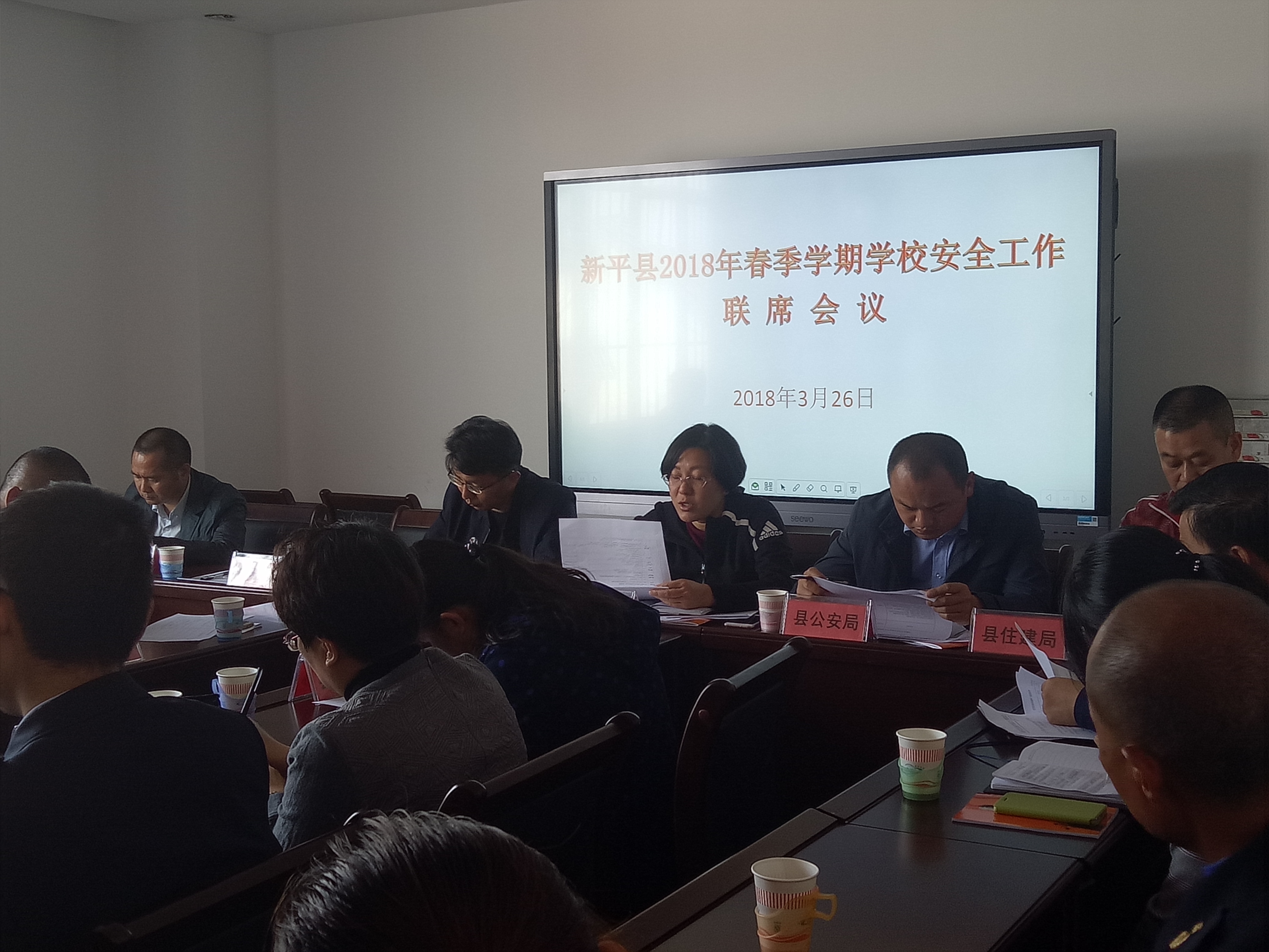 2018年3月26日,新平县人民政府召集全县学校安全工作联席会议成员单位分管领导和相关业务人员,在县教育局三楼会议室召开了新平县2018年春季学期学校安全工作联席会议。会议由县政府办副主任黄英同志主持。 会议首先由县教育局长赖朝东同志向与会人员汇报我局在校园及周边环境治理工作中所采取的主要做法及取得的成效。同时,提出了校园及周边在社会治安、食品安全、道路交通安全、文化环境、学校安保及防溺水等方面存在的问题及问题解决的建议。紧接着,县公安局、县住建局、县市场监督管理局、县交警大队、县水利局就本单位在校园及周边环境治理中的工作情况及下步工作打算进行了交流发言。 会议最后,县政府办副主任黄英同志就全县学校及周边环境治理工作进行总体安排和部署:一是通报玉溪市人民政府2018年督查情况,并敦促各部门沟通协调、齐抓共管、落实整改;二是具体安排部署本次开展校园及周边环境综合治理工作,她希望各部门各司其职、突出重点、形成合力,积极开展校园及周边环境综合治理工作;三是要求各乡镇(街道)、各成员单位要加强领导、压实责任、协调配合,确保校园周边综合治理工作取得实效。 此次联席会议的召开,既为全面推动校园及周边环境治理工作迈出了坚实的一步,更为营造学校安全稳定的学习环境奠定了坚实的基础。