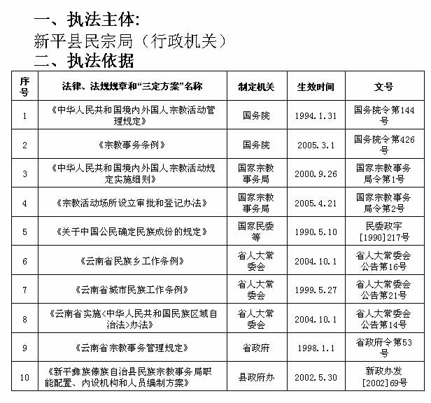 ��2、具体执法机构名称:新平县民宗局。