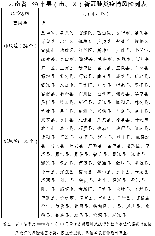 2月19日,云南省应对疫情工作领导小组指挥部发布第10号通告,通告全文如下: 中共云南省委 云南省人民政府 应对新型冠状病毒感染肺炎疫情 为贯彻习近平总书记“科学防治、精准施策”指示精神,落实省委、省政府“从全面防控向精准防控、重点防控转变”的工作要求,实施差异化防控措施,结合我省疫情形势,现提出以下实施意见:(一)科学评估原则。以累计确诊病例数、近期疫情发展趋势及二代病例数、聚集性疫情等要素为评估依据,以县域为单位将疫情风险分为高、中、低3个等级。(二)精准施策原则。各地须根据本实施意见,细化本地防控方案,做到一县一策。(三)动态调整原则。各地根据疫情发展态势,动态开展疫情风险评估,适时调整防控措施。低风险地区:无确诊病例,或连续14天无新增确诊病例。中风险地区:14天内有新增确诊病例,累计确诊病例不超过50例;或累计确诊病例超过50例,14天内未发生聚集性疫情。高风险地区:累计确诊病例超过50例,14天内有聚集性疫情发生。在机场、火车站、高速公路和国省干线省界入口,所有拟入滇人员须填写《个人健康申报表》,接受体温检测,如有发热、咳嗽等情况,就地隔离排查,同时实施人员分类管理:1.对湖北省内已实施交通管控州市的拟入滇人员,一律劝返。2.对湖北省内未实施交通管控州市的拟入滇人员,在滇有工作单位或有固定居所的,集中隔离医学观察14天;在滇无工作单位或无固定居所的一律劝返。3.来自其他疫情高风险地区的拟入滇人员,须填写《个人健康申报表》,集中或居家隔离观察14天。居家隔离的要自觉接受社区管理。4.来自非疫情高风险地区的拟入滇人员,须填写《个人健康申报表》。1.低风险地区全面恢复到疫情发生前的正常生产、生活秩序。(1)保证交通畅通,不得封路、封村、封社区、封市场。(2)全面复工复产,积极帮助企业解决用工、原材料、资金、设备等方面的困难和问题。对企业复工复产不得以审批、备案等方式进行限制。(3)城市社区、农村村委会对所有外来人员实行网格化排查和管理。加强城中村、城乡接合部、厂矿、工地等重点部位的疫情监测。(4)医疗机构继续落实预检分诊和发热门诊管理,对所有发热和咳嗽病人及时进行排查。保留定点医院和集中隔离观察场所。(5)大力开展爱国卫生运动,开展环境整治和健康知识普及。(6)密切关注周边地区疫情动态,开展风险评估,适时调整风险级别和防控措施。(1)无确诊病例的乡镇、街道、城乡社区,可参照低风险地区的防控措施,保证正常的交通、生产、生活秩序,开放景点景区。(2)在对疫情有关场所和人员采取必要防控措施的同时,合理安排复工复产,落实企业疫情防控责任,配备必要的个人防护用品,并做好通风、消毒、体温监测等防控工作。(3)将确诊病例、疑似病例全部收入定点医院治疗,对无症状感染者按确诊病例管理,减少重症和死亡病例。(4)对密切接触者进行严格追踪管理,全部采取集中隔离医学观察,控制二代病例和聚集性疫情。(6)对连续14天无新增确诊病例的县域,可及时调整为低风险地区。3.高风险地区采取“内防扩散、外防输出、严格管控”的防控策略,实施严格的疫情防控措施。(1)对有确诊病例的疫点实行隔离和封闭管理,对出现聚集性病例的居民小区(村组)实行区域封锁。(2)保障疫情防控、公共事业运行、群众生活必需及其他涉及重要国计民生企业正常运转。指导其他企业采取灵活方式安排员工工作。出现确诊病例的企业应立即停工停产,直到评估合格后方能复工。(3)暂停大型会议、会展、演出、体育赛事、聚餐、娱乐休闲等人群聚集性活动。(4)采取一切有效措施严防疫情向周边地区输出、扩散,把疫情控制在最小范围。依法按程序审批后,可实行区域交通管控。(5)对连续14天无新增聚集性疫情的县域,可及时调整为中风险地区。1.在全省范围内使用“云南抗疫情”微信小程序扫码登记。重点是人员流动性大、相对不固定的公共场所。对住宅小区、学校、办公场所等,可自愿扫码,不作硬性要求。(一)强化属地责任。各地要按照“坚定信心、同舟共济、科学防治、精准施策”的方针,严格落实分区分级精准防控要求,由全面防控向精准防控、重点防控转变,统筹推进疫情防控和复工复产各项工作,推动经济社会秩序逐步恢复正常。(二)坚持依法防控。坚决纠正偏颇和极端做法,不搞攀比,不搞“一刀切”,不搞层层加码。省应对疫情工作领导小组指挥部此前发布的通告与本通告不一致的,以本通告为准。云南省应对疫情工作领导小组指挥部 附件 云南省129个县(市、区)新冠肺炎疫情风险列表