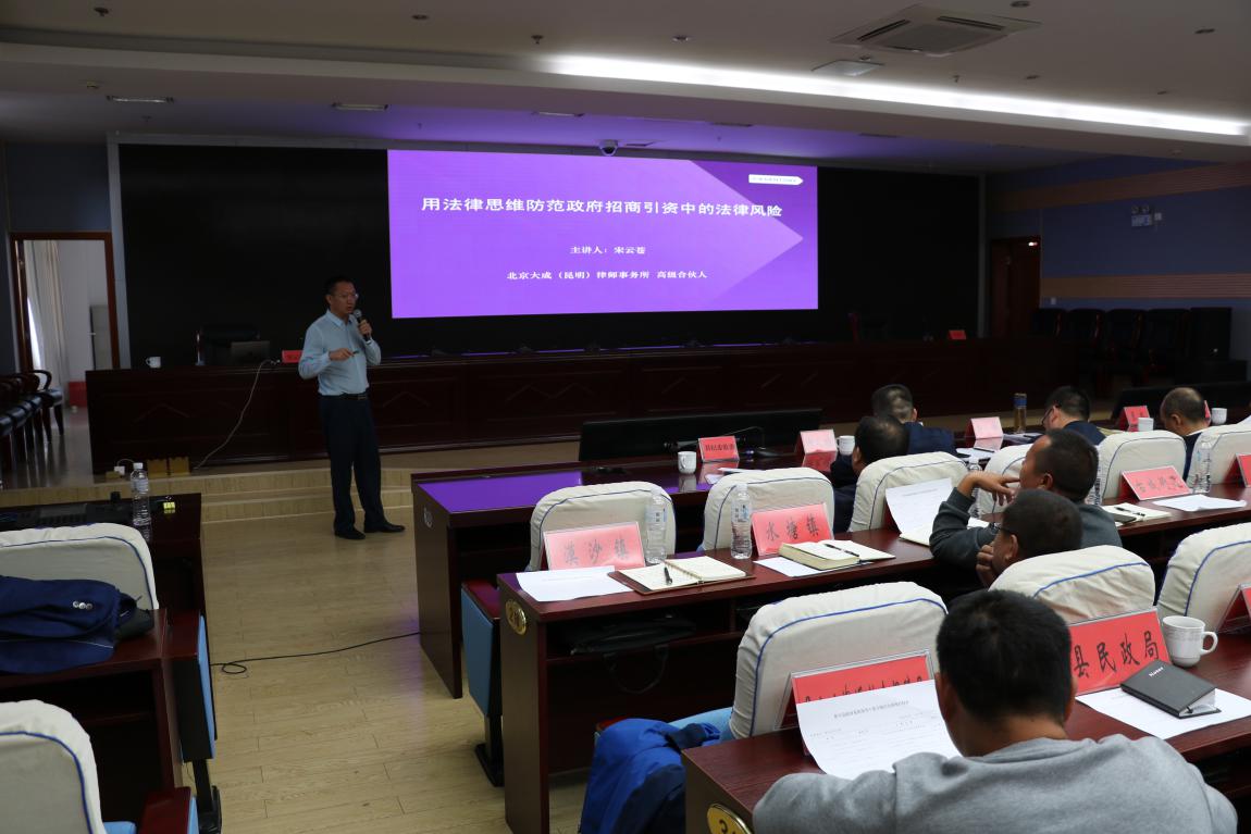 县人民政府法律顾问、北京大成(昆明)律师事务所宋云苍律师从最高院案例、政府招商引资中的常见法律风险、招商引资的法律风险类型、法律风险产生的原因以及用法律思维防范政府招商引资中的法律风险等方面作了《用法律思维防范政府招商引资中的法律风险》专题讲座。